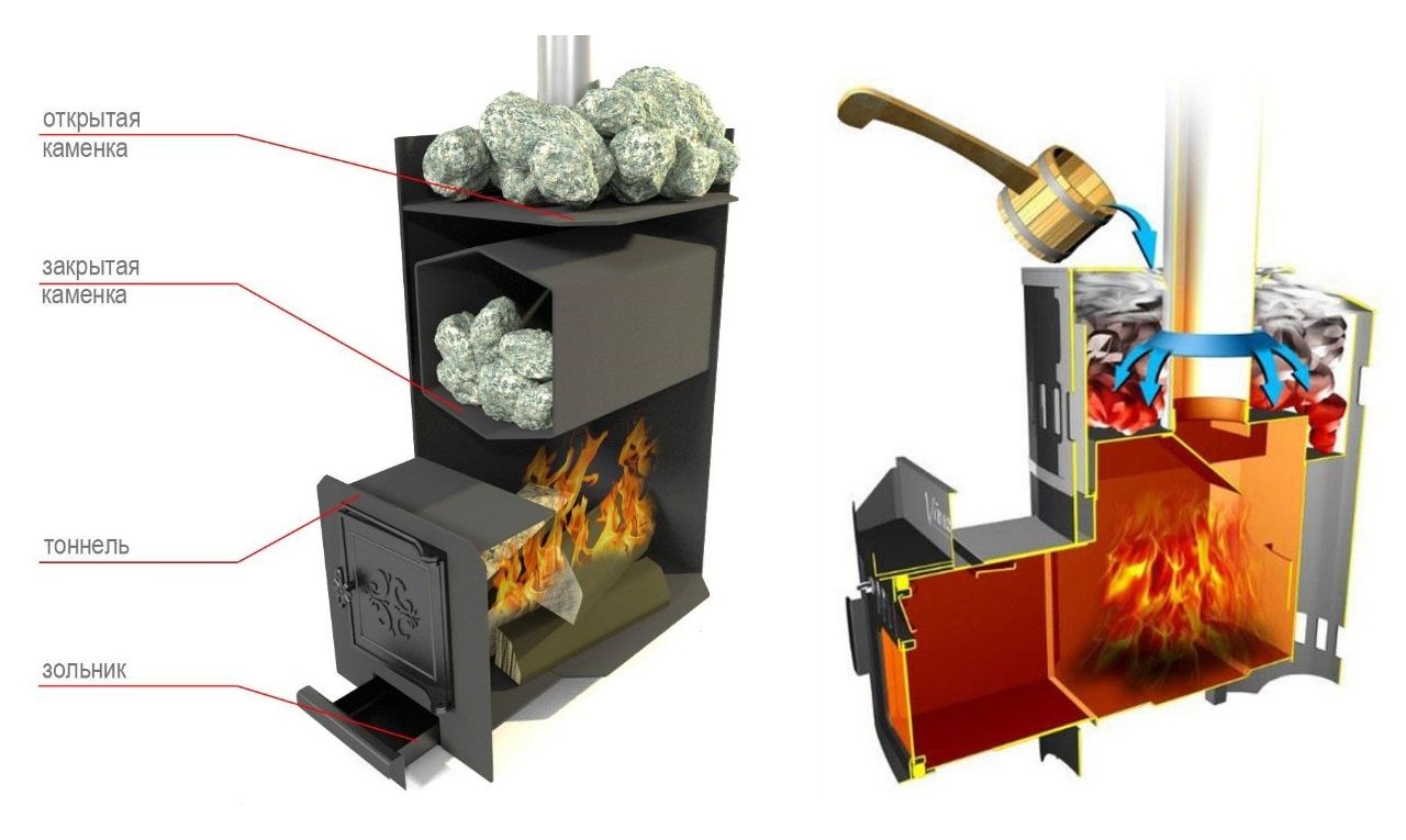 Конструкция печи очень проста: источник тепла нагревает камни, которые располагаются вокруг камеры сгорания. При необходимости на эти камни можно налить воду для получения пара.